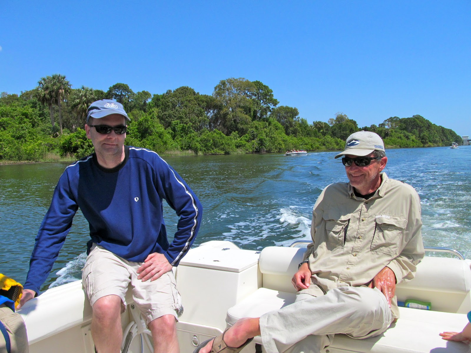 Mid morning we headed to the dock to meet up with Tim's brother Rod and our nephews, Rodney and John. The plan was to head out on the boat and do some fishing. This was Eli & Cole's 1st real time fishing. The boat ride was nice and it was especially awesome to watch Eli & Cole interact with their cousins when we were hanging out. We don't get to see them often so it is great to watch their friendships and relationships develop. I took LOTS of pictures on the boat. It was just a fun time. We also saw dolphins near the boat and the shadow of a manatee. The boys loved the boat ride.