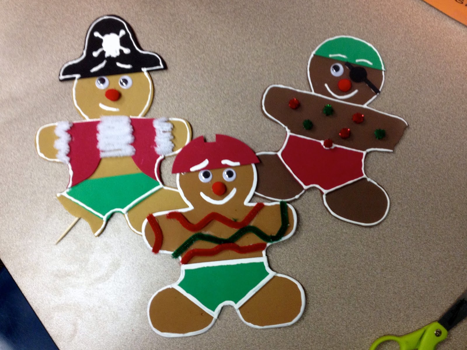 Today I volunteered in Eli's class to do a Seasonal Craft. We LOVE the Gingerbread Pirates in our house so being the Nerdy Mom that I am, I decided to combine reading a book with a quiz and a craft. The first thing we did was get all the kids together and I read the book 'Gingerbread Pirates'. I wore my own little Pirate hat (did I say Nerd yet?!) and then asked them a few questions about the book. It was a good way to get them to pay attention but also to reinforce the educational side. Reading, Comprehension and Answering questions. After reading, each child was able to make their own Gingerbread Pirate with a little kit I had made them - brown foam gingerbread man, pipe cleaners and some other colored foam pieces. It was really fun to see what the kids created. I think they really enjoyed it!